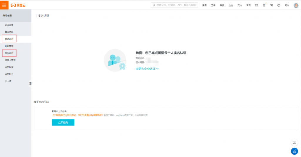 如果没有阿里云账号,请先注册账号。另外实名认证、学生认证什么的按照提示操作即可,因为要上传身份证信息可能有人会担心信息安全的问题。在担心这个问题之前先想想自己用不用支付宝、淘宝?