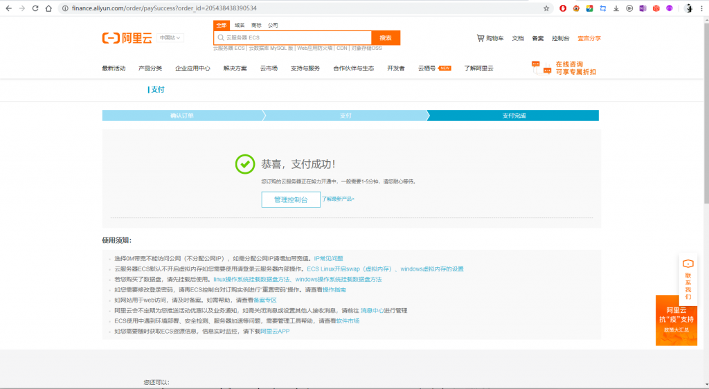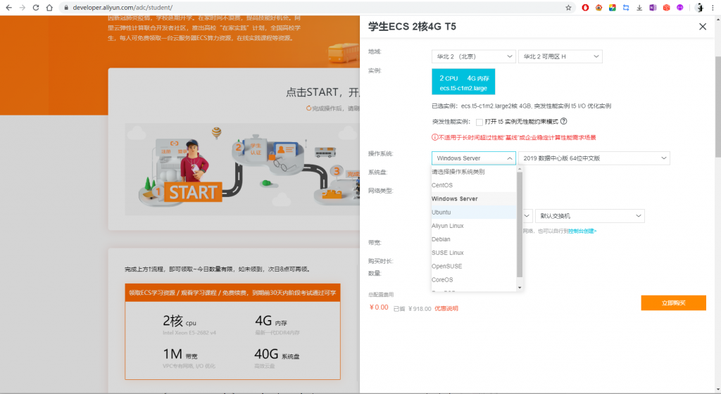 之后就点击立即购买,按照提示一直点点点支付0元,就能成功领取一台服务器了。